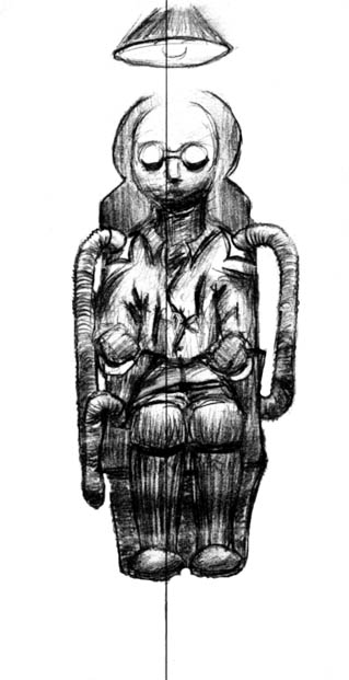 Really my first try at anything like this... it came out interesting... I sketched it late last night on lined paper, and then scanned it and played with the levels till I got rid of most of the lines, and darkened the rest of it a bit. I couldnt get rid of the center line completely, so what'd I do? Darkened it. |